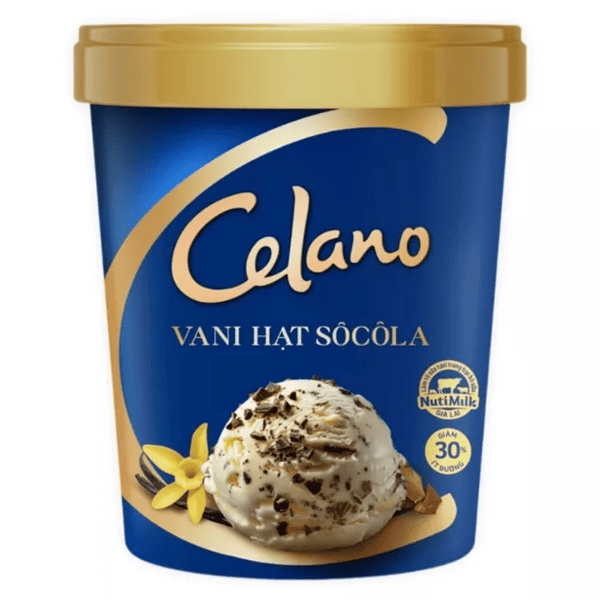 Kem hộp Celano vani hạt socola được sản xuất từ nguồn nguyên liệu tươi ngon, đảm bảo chất lượng. Vị kem mát lạnh mang lại sự ngon miệng, sảng khoái cho người thưởng thức.
